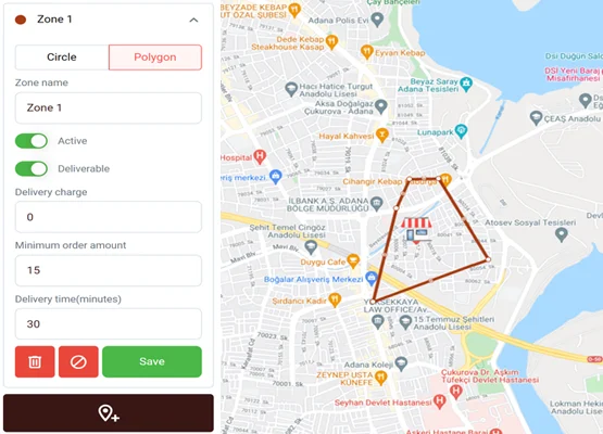 Circular and polygonal delivery zones, Multiple delivery zones Minimum order amount, max delivery time and more ...