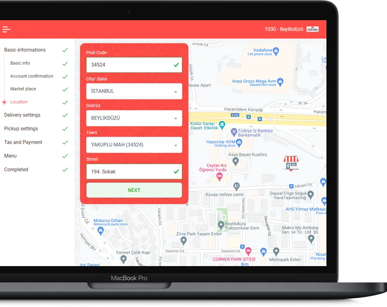 Follow up current orders, payment and buying settings, changing your opening times, map and payment settings on your delivery areas.